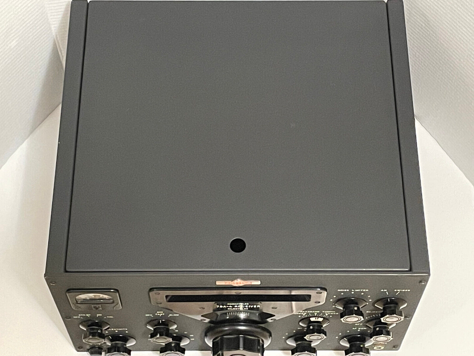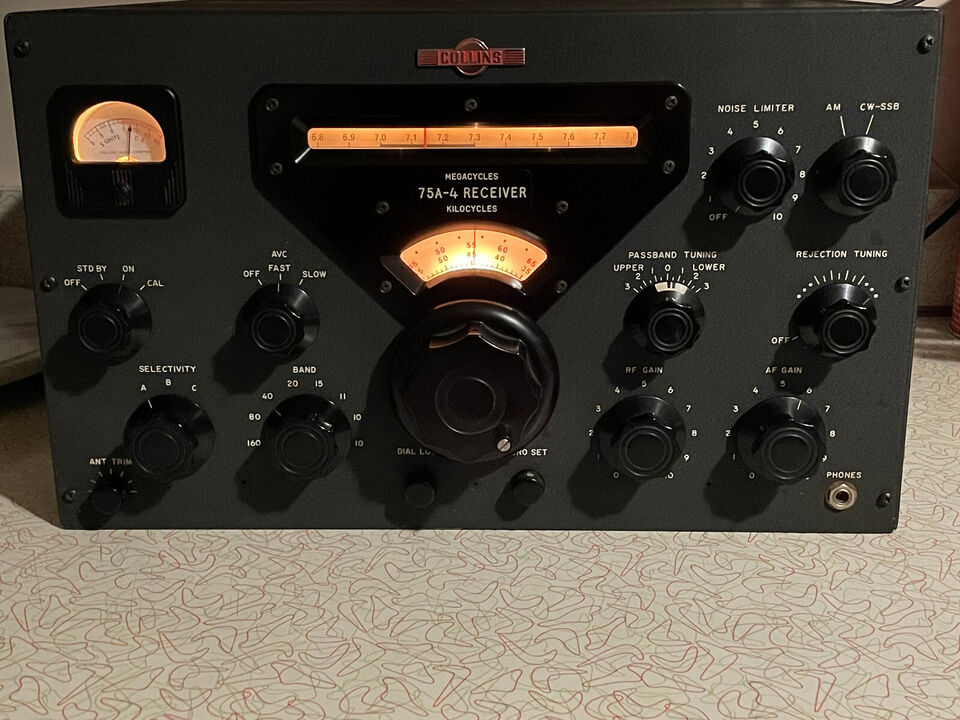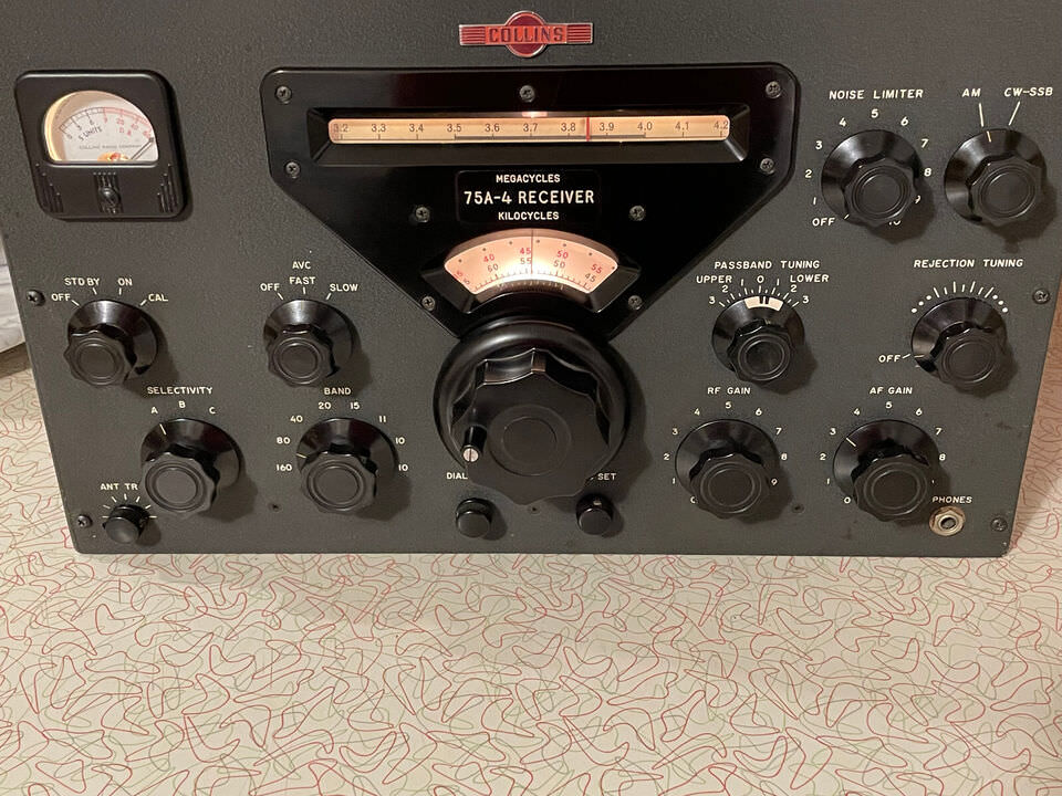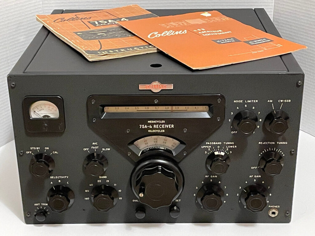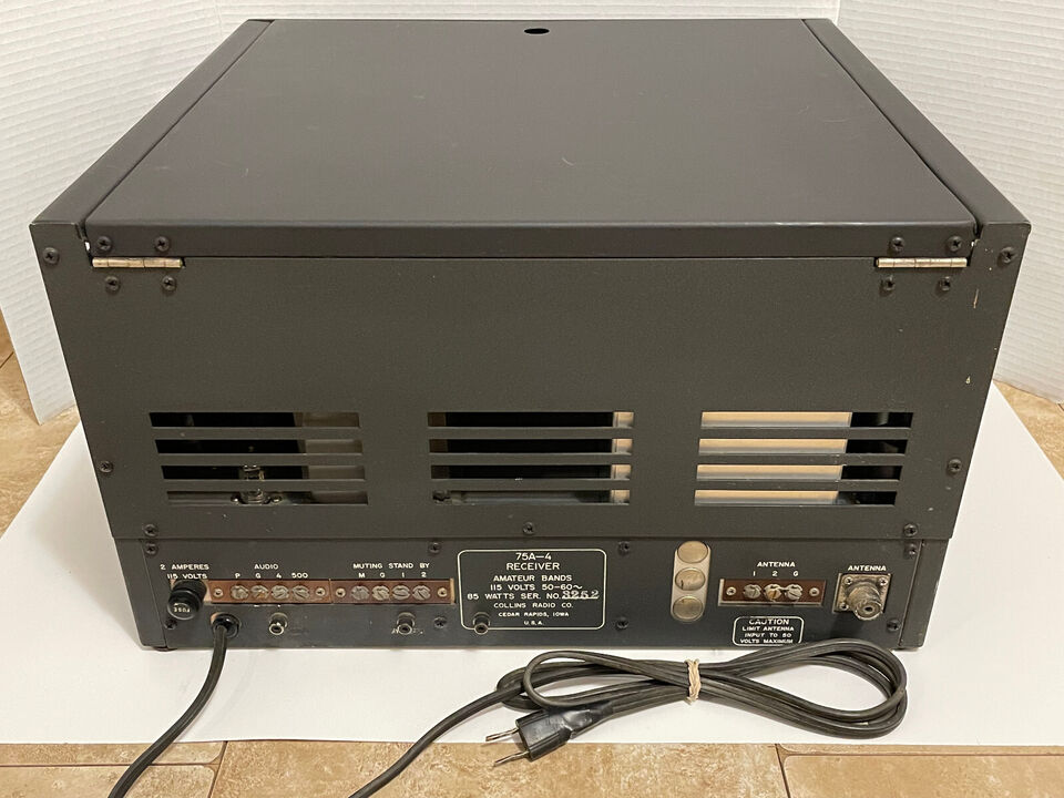 Please see all pictures as this vintage Collins ham radio receiver presents itself with fantastic appeal and class. Item is free from any loose particles inside/outside it’s original chassis. Item also appears to be free from any non original drilled holes, major denting, etc. It is evident that the original, one time previous owner did store and/or operate this item with care. Item was stated to be paired with a KWS-1 transmitter in an active ham radio station that centered around Collins radio equipment. This item includes it’s original chassis, which includes all factory marking(s) that are legible as shown in multiple pictures. Parts inside do appear to be original including transformers, tube sockets, etc. This item is super clean top and bottom inside as pictures three, five and twenty portray. The front panel of this receiver retains it’s original factory paint, lettering, knobs, etc. All original front panel parts are intact and functioning as shown. The meter and both dials are original, intact and free from cracking. Each dial turns smoothly and correctly both ways; and the DIAL LOCK does function just the same. The original Collins winged emblem is also intact and stationary. All knobs are matching, functioning and/or switching correctly. This receiver was also found with it’s original PHONES jack present as shown, too. Please see picture two to note the excellent condition of the back side of this item. Again, all original factory paint and verbiage is present and legible. This item includes all original back side connections and/or parts as well as it’s original factory stamped serial number; and this receiver does have it’s original line cord/plug. (small area of electrical tape on line cord) All venting is intact and free from any denting around the original cabinet. The original owner did repaint the top cover of this receiver and did a neat job. (see picture seven) The top cover does open and close correctly. Please see picture seventeen to note the cleanliness inside the original cover… and some light wear/age. The sides of this item, as suggested in pictures nine and ten, also appear to have been touched up by the original owner as well. This item was briefly tested with a quick loop antenna and some Morse code was heard. (works*) Please see pictures ten through sixteen to see this receiver powered on with front panel, tubes, etc. lit during brief testing. (works*) All tubes are included as shown, but have not been tested individually. Pictures ten and eleven demonstrate the BAND switch functioning correctly when switched, as well as both AM/CW-SSB being tuned. Picture twelve displays the STD BY and ON modes also functioning per the meter shown above. (works*) The AF GAIN and RF GAIN appear to be functioning; pictures thirteen and fourteen demonstrate the meter’s movement. (works*) As stated testing was brief, there are close up pictures of tubes being lit when this receiver is powered on. No other testing was done and only what is shown in the pictures is included in this auction. Item was found with the two filters shown in pictures eighteen and nineteen, and a third filter may have been included inside the bottom area of this chassis. Please utilize ZOOM when reviewing picture twenty for more details. Item was also found with two original manuals. One is for this receiver itself, the other likely was originally with this item when it was paired with it’s Collins KWM-1 transmitter. Both original manuals are complete, and in good overall condition with some wear/age… and included as shown. With mentioning again the KWM-1 transmitter this receiver was paired with, please note this receiver was found without it’s bottom cover. The previous owner, who is the original owner of both pieces, did not recall where the bottom cover went to after some electronic updating was done over the years; therefore this 75A-4 is being sold just as it was found. Although this Collins receiver is not NOS/mint in condition, it definitely has potential to be an awesome addition to your period Collins radio station and/or collection. Whether leaving this item as is, or giving it a few minor finishing touches… this is surely one clean Collins receiver inside and out.